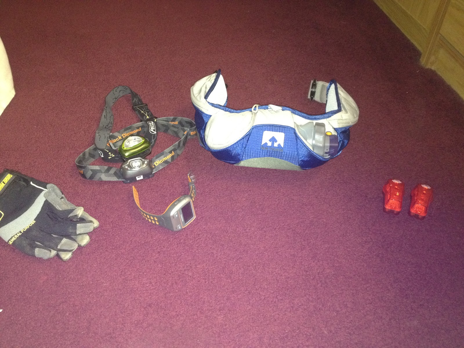 The gear started to roll in today. I already have my headlamps, strobes, GPS Heart Rate monitor, one pair of gloves and now its time to add more. After a spending spree the other night on my supplemental nutrition and some last minute gear items they are all starting to come in for the upcoming race. Meaning it is inching ever closer to race day. The first item arrived today, like Christmas except I bought it myself, a Nathan Flurry hydration belt.