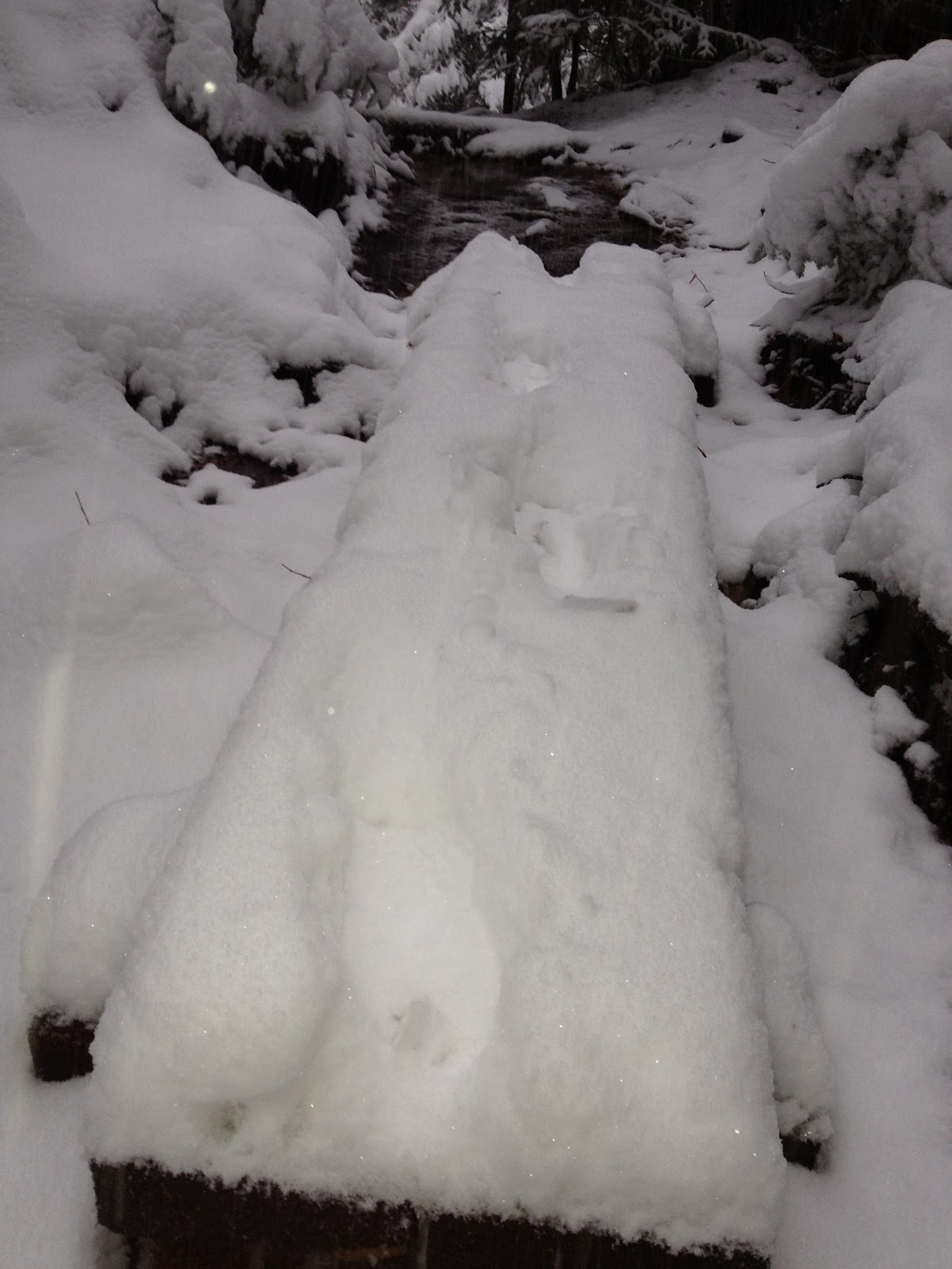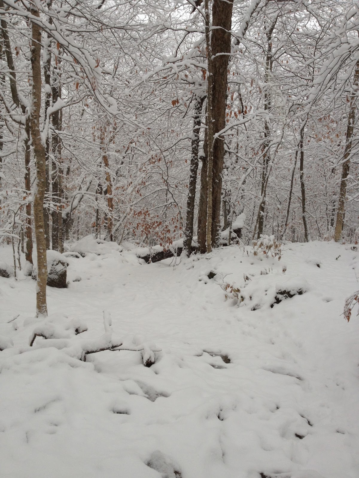 As I headed up the trail, I couldn’t help but find joy as I had to duck and dive around snow covered branches. A couple times the snow found its way off the trees and down my back. As the music pumped, my cracks in fact did not show they seemed to close up as the blanket of white covered any imperfections in the landscape. The snow crunched under my feet. I kept moving, not very fast but kept moving. The negative thoughts started to dissipate as my focus turned to the ground and not slipping on covered rocks. Even a smile came over my face at I carefully took each step. Next thing I knew I was at the top, the top of the overlook, although there was not much to see, the white blanket over the landscape calmed me, this is why I do this to be outside, able to move around, feel the snow and trail under my feet. I jogged down the trail at times looking like Pheobe just trying to stay balanced. This was fun, for the first time in over a week it felt good to be out.