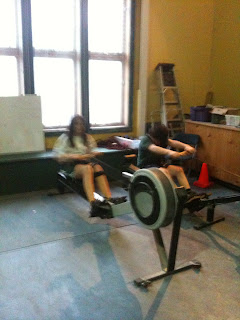 My experience on rowing machines is very little Steve started out showed me the technique and we were off. We each did 10 sets pulling 250 meters at a time. I had to keep the time below 1:55. I was pouring sweat, at this point I was down to a sports bra and shorts and the grunting as I pulled harder and harder. The hardest sets were the ones in the middle. By the last two I had some rhythm down and was able to pull much more efficiently. The whole time as I was getting fatigued and slowing up, Steve kept yelling, “GUT CHECK TIME.” GUT CHECK I heard over and over again in those last 100 or 50 meters when I was ready for the rest.