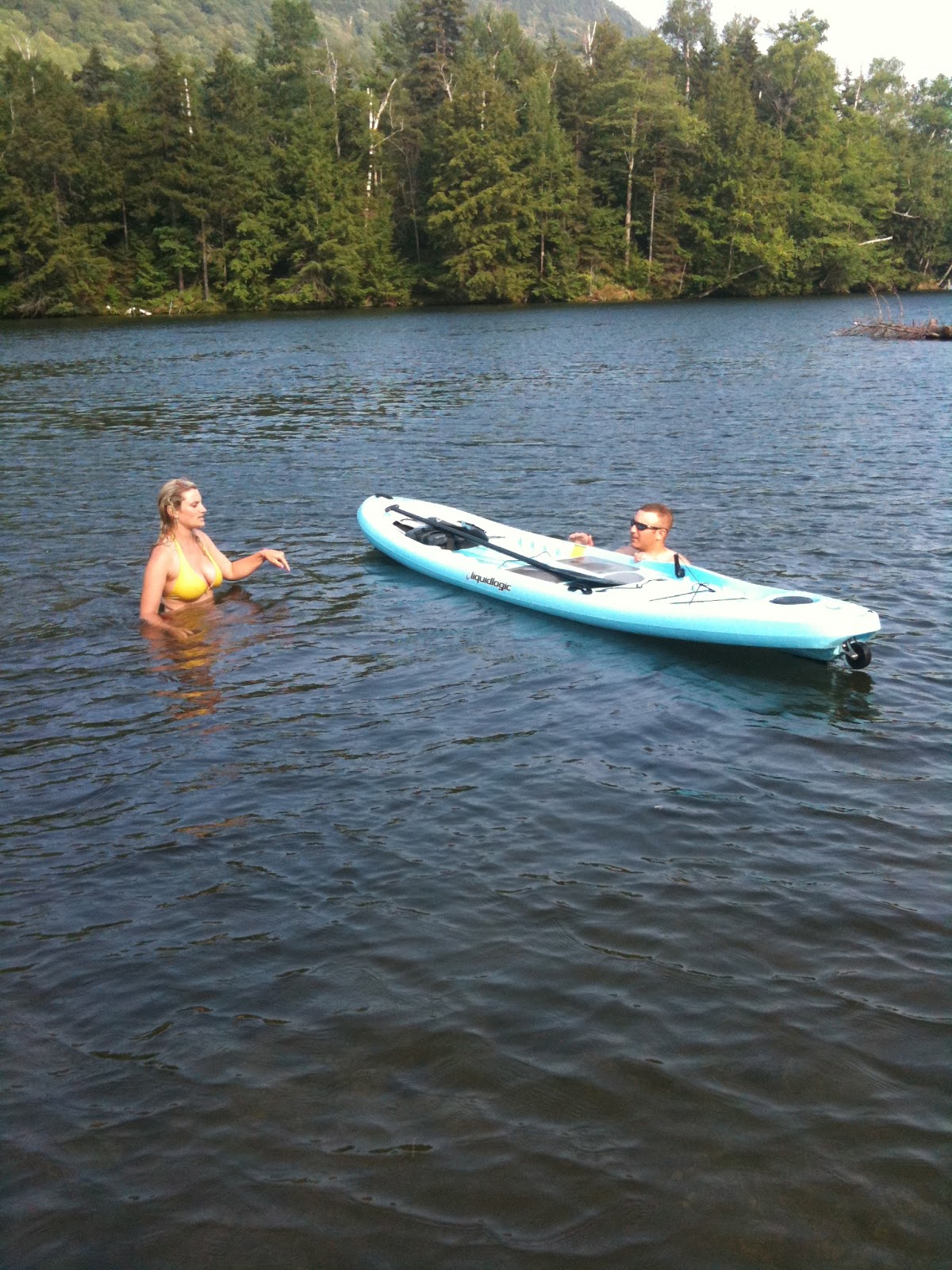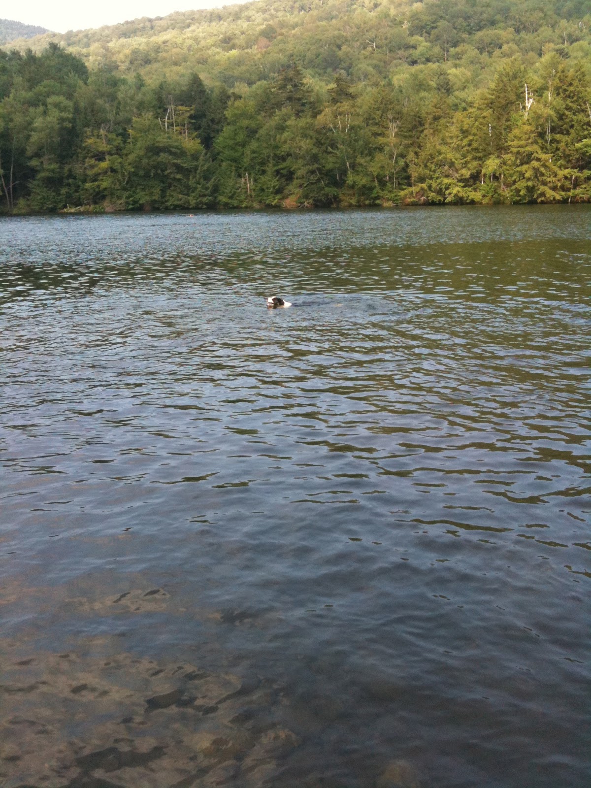 Today, I was a solo swimmer so I brought along a spotter, Madalyn who brought along Ruger her dog for company. She had been wanting to try out my stand up paddleboard and I wanted a spotter for the swim, just in case. It helps she is also a first responder on the Killington Fire Rescue with me. I picked her up and we headed to Woodard Reservoir. I showed her how to get on and paddle the board and I took off in the water. My total swim time was 1:03.57. I kept a steady pace the whole time. Every once in a while I would look around to see if Madalyn was still near me. She stayed with me the whole time. When we got back to the drop-in her boyfriend and another friend met us. They were surprised at how far I had gone. It felt good, I was really sore in the morning and the swim actually helped to loosen up.