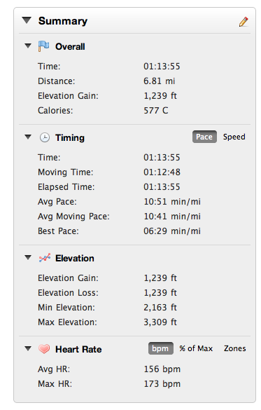 The real appeal for me in getting this GPS/heart rate monitor was it’s battery life (20 hours). Now I know this is overkill for most people and the watch was designed for the multi-sport athlete. However, as my training increases that 20 hours will prove to be helpful. I have a couple 24 hour sessions scheduled after my ultra marathon is over. This is a very short review and I will go into more detail at a later date. I will let the screen shots speak for themselves. These are just a few of the stats you can get after your run, along with a map and all the other things I was able to get with my iphone app. I love stats an all the techie stuff, so for me looking at all the data afterwards is really appealing. This device definitely is a game changer and will help me become more focused on my training.