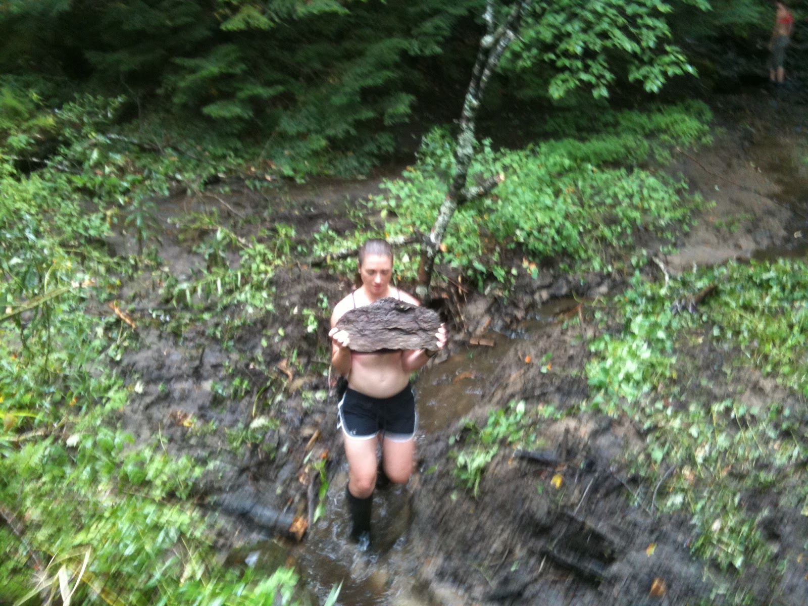 It only took a couple hours with the three of us and it’s amazing how anything you can turn into training and Death Race training. After picking up several large rocks, chopping down large limbs to take out of the stream, pulling branches and tree trunks, and digging out a lot of silt, I was feeling like this was a scene from the Death Race. Heather, her boyfriend Tyler and I turned an activity that many might think of as awful into a time to clean, laugh and have fun. We waded through water, picked up rocks and mostly laughed. My bogs were the best boots for the job!