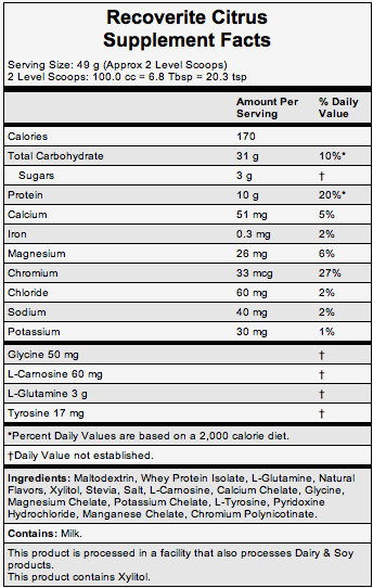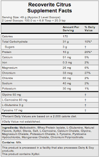 Receoverite is pretty straight forward and is a recovery drink. It’s not what I will be drinking while I am on the race course but you know I will be mixing it up on the way home. It helps with glycogen replacement, electrolyte replacement, and muscle tissue repair. It has 85 calories per scoop. They have a citrus flavor that is good along with Strawberry.